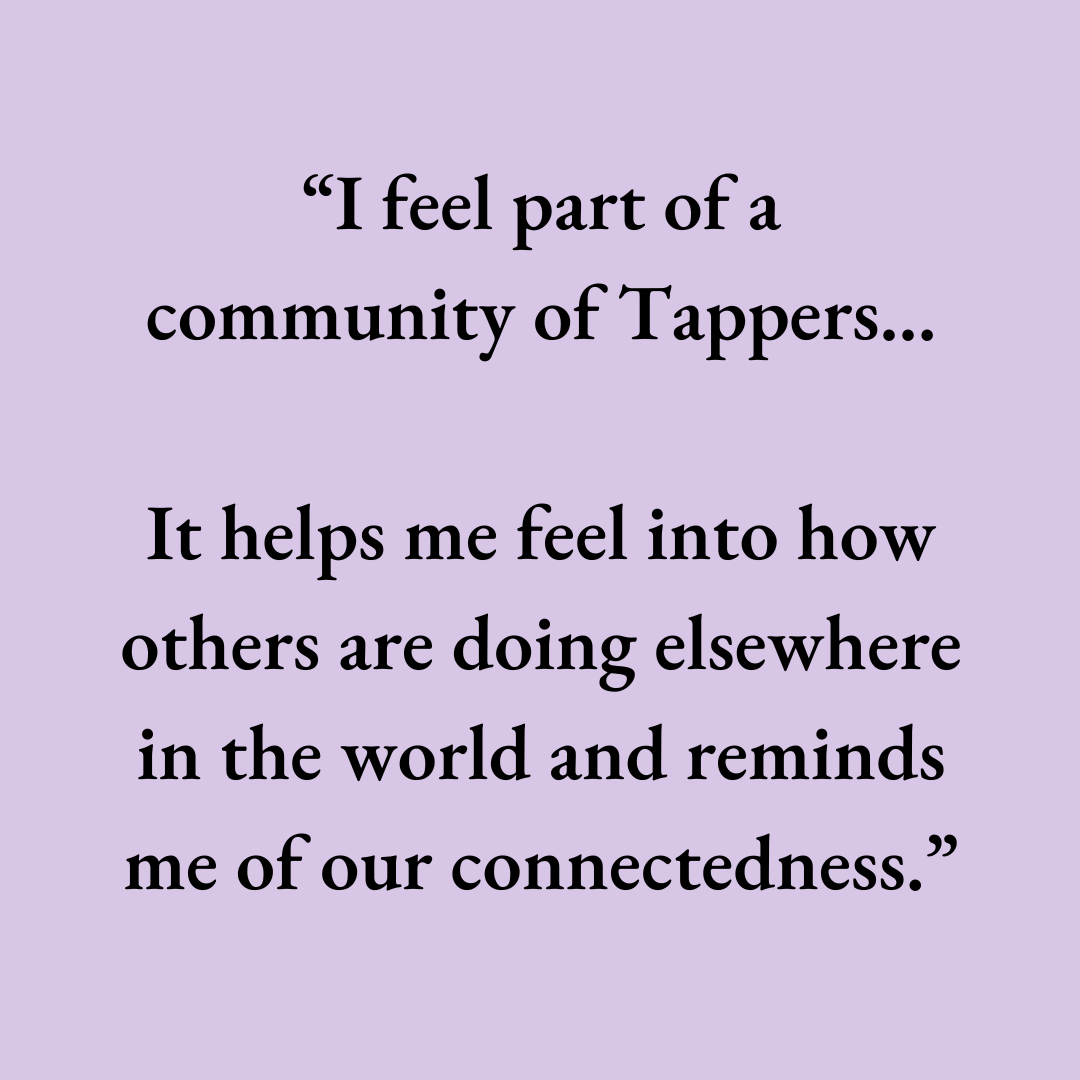 "I like the live group tapping because again, I feel part of a community of tappers, a rare breed apparently. It helps me feel into how others are doing elsewhere in the world and reminds me of our connectedness.